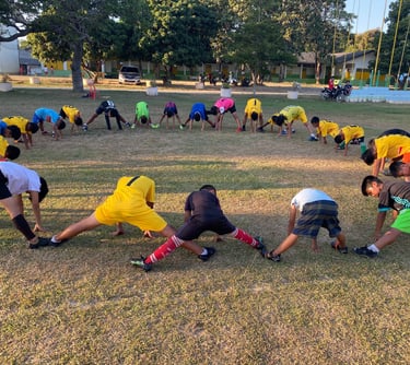 Treinamento semanal de futebol para desenvolver disciplina, saúde, trabalho em equipe e caráter.